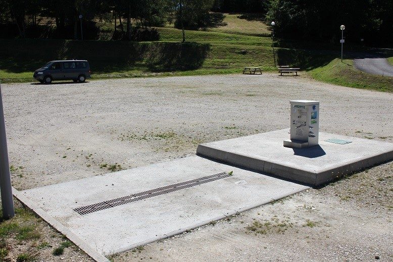 La borne artisanale est équipée pour la fourniture d’eau. Elle fonctionne au moyen de jetons (2 €) que l’on peut se procurer au Bar du Lac et à l’office de tourisme. Seul inconvénient : la dalle de vidange est trop proche de certaines places de stationnement et elle est équipée d’un regard transversal qui, faute de pentes suffisantes, ne capte pas tous les ruissellements.