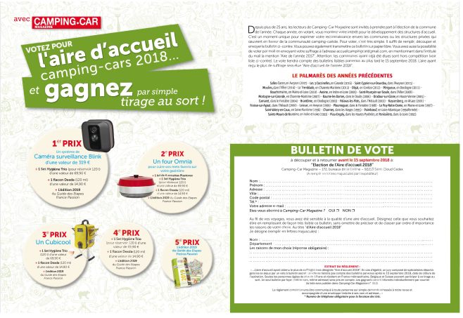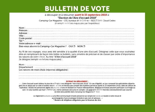 Une fois encore, Camping-Car magazine donne la parole à tous les camping-caristes. Chacun peut ainsi participer à choisir la plus belle aire de France. Pour voter, rien de plus simple. Il suffit d'imprimer et de remplir le bon ci-dessous puis de le transmettre à l'adresse suivante :