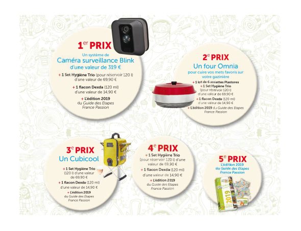 La deuxième étant que vous pouvez, par simple tirage au sort, gagner plusieurs lots : un coffret de caméras de surveillance Blink, un four Omnia pour réaliser des gâteaux en camping-car, des assiettes Plastorex, des produits d'entretien WM-Aquatec pour l'hygiène des réservoirs d'eau de votre véhicule, des guides France Passion...