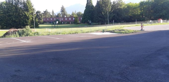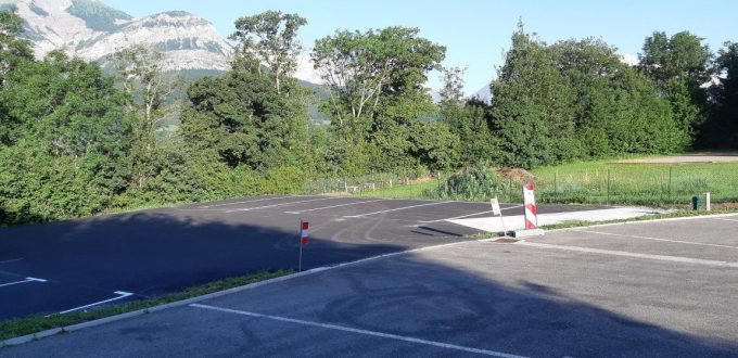 Huit emplacements sont matérialisés sur le sol en enrobé. L’aire se trouve au bout du parking de la piscine.