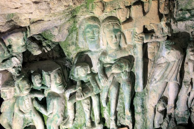 Oeuvre unique en Occident, ce site est au cœur d'un site troglodytique important. L'origine de ces sculptures est entourée d'un véritable mystère… Les archives n'ont pas encore livré assez d'indices pour permettre d'affirmer que les sculptures sont contemporaines du XVIe, XVIIe ou XVIIIe siècles, ni sur la personnalité de leurs auteurs (peut-être des tailleurs de pierre contestataires). Les personnages, taillés en ronde bosse, s'enchevêtrent en une gigantesque bande dessinée sculptée. Figures grimaçantes et visages angéliques, costumes somptueux et corps dénudés, géants difformes et créatures chétives s'entremêlent, sans soucis de proportions, en une frise caricaturale et truculente, sorte de pamphlet révélateur des mœurs d'une époque lointaine.