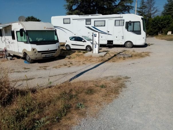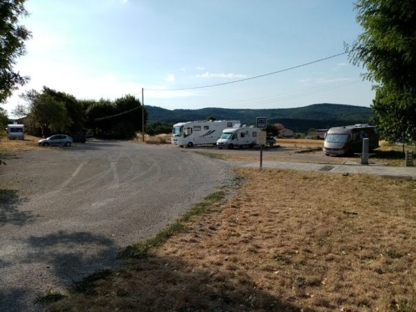 L'aire profite d'un revêtement stabilisé avec des emplacements matérialisés par des traverses en bois. Une dizaine de places sont à disposition. Le stationnement est totalement gratuit, contrairement aux services logiquement payants.