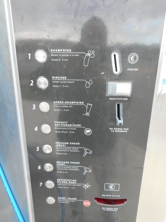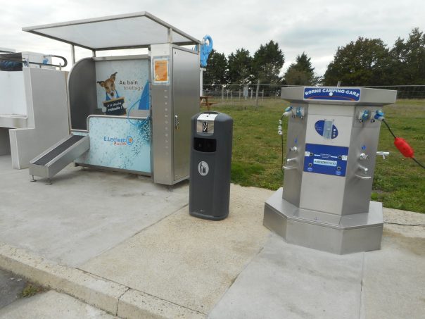 Juste à côté de la borne de vidange et de plein d'eau destinée aux camping-cars, le gestionnaire du supermarché a installé un bac à douche pour shampooiner les chiens. Une installation propre et, de toute évidence, appréciée par les camping-caristes très souvent accompagnés d'animaux de compagnie. Pour 7,50 € à régler par pièces ou par jetons à acheter à l'accueil du magasin, votre compagnon à 4 pattes aura droit à une douche chaude avec le shampoing, le rinçage et même le séchage.
