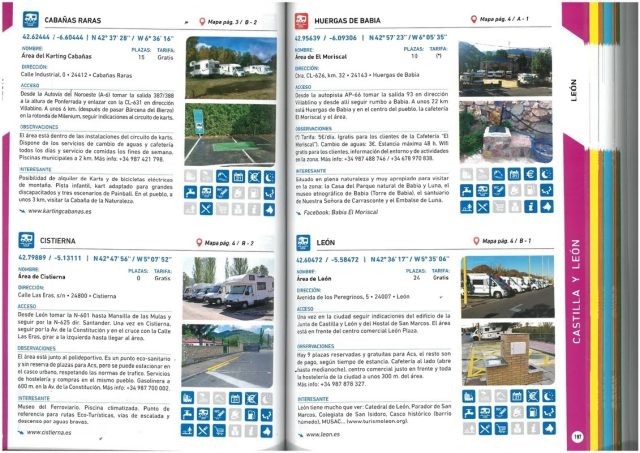 Chaque aire est localisée par coordonnées GPS indiquées dans les deux formats (décimal et Degré/Minute/Seconde). Des commentaires fournissent de précieuses indications sur l'installation et les alentours. Dommage que ces commentaires soient rédigés uniquement en espagnol.