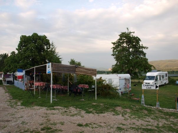 Nous avons vu un panneau signalant une aire de stationnement à l’entrée de Peyruis. Nous nous y sommes arrêtés pour obtenir des renseignements. L'accueil des propriétaires a été très sympathique. Ils nous ont proposé un emplacement agréable pour un tarif acceptable. Il ne faut pas craindre le bruit de la route et du chemin de fer (le seul train que nous avons entendu est passé au petit matin. Quant à la route, elle n'a généré aucune nuisance.)