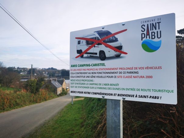 Ce texte surmonté de la photo d’un camping-car barré de rouge apparaît sur un panneau posé à la demande des élus de Saint-Pabu, à l’entrée de cette commune du Finistère.