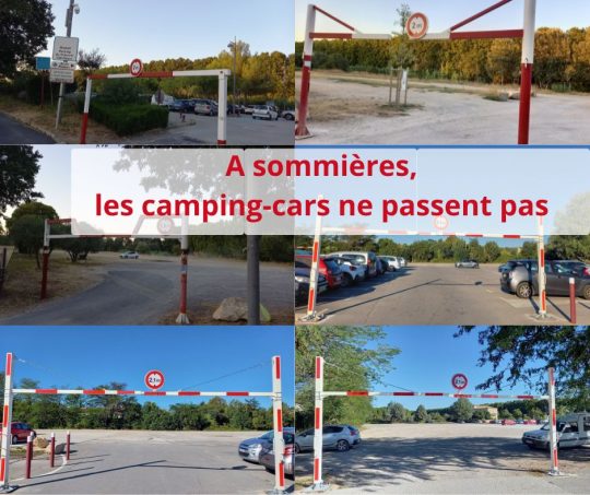 De passage à Sommières (Gard) j'ai constaté que les camping-cars étaient tout simplement bannis de cette commune. Désormais tous les parkings sont dotés de portiques et de panneaux interdisant le stationnement des camping-cars. Comble de la hargne municipale, la place des arènes est, elle, parsemée de panneaux d'interdiction de… s'arrêter (oui vous avez bien lu). Seule place en centre-ville, il vous est interdit d’y poser les roues de votre camping-car, pour faire une course, visiter le village ou se rendre au restaurant.