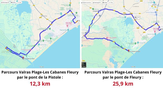 La mise en place d'une barre de hauteur à l'entrée du petit pont, oblige don les camping-caristes (et les conducteurs de poids lourds) à se rendre jusqu'au pont de Fleury sur la D618, quelques kilomètres en amont, pour franchir l'Aude et regagner la D718 qui mène à l'aire des Cabanes de Fleury.