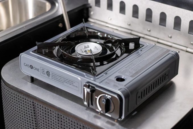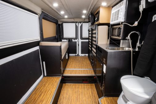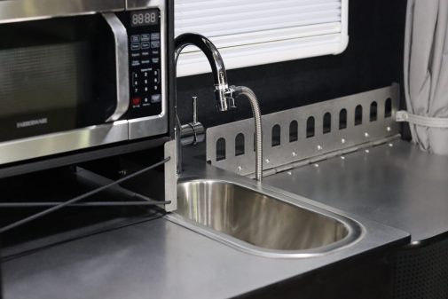 Côté cuisine, on retrouve un réfrigérateur de 76 L, un micro-ondes, un réchaud portatif et un petit évier en acier inoxydable. C’est sur ce robinet que le pommeau de douche est directement branché. Car juste à droite de l’espace cuisine siège la salle d’eau qui est cachée sous le plan de travail. Les rangements de ce petit véhicule sont spacieux. Positionnés en haut pour la plupart, ils sont refermés par un système de filets.