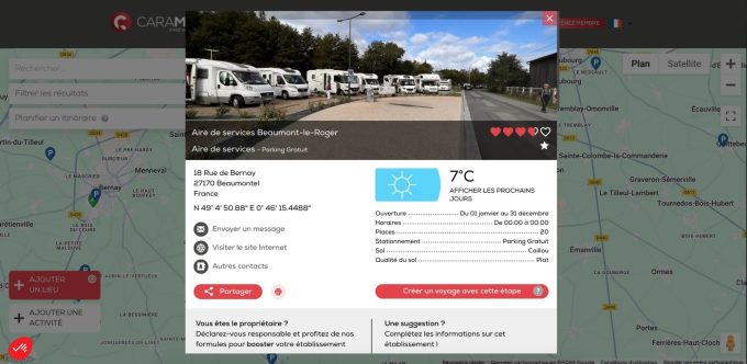 D'autres applications et site internet suivent la même lignée. CamperContact est par exemple une autre référence, avec près de 50 000 aires et campings répertoriés. Autre possibilité : se rendre sur CaraMaps, dont le fonctionnement est très simple puisque, depuis une carte, il est possible de cliquer sur des petites vignettes offrant des possibilités de stationnement afin d'avoir, grâce à l'apparition d'une fiche, plusieurs informations sur le spot, comme la qualité du sol, le type de revêtement, la durée maximale de stationnement ou encore, évidemment, le nombre de places.