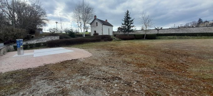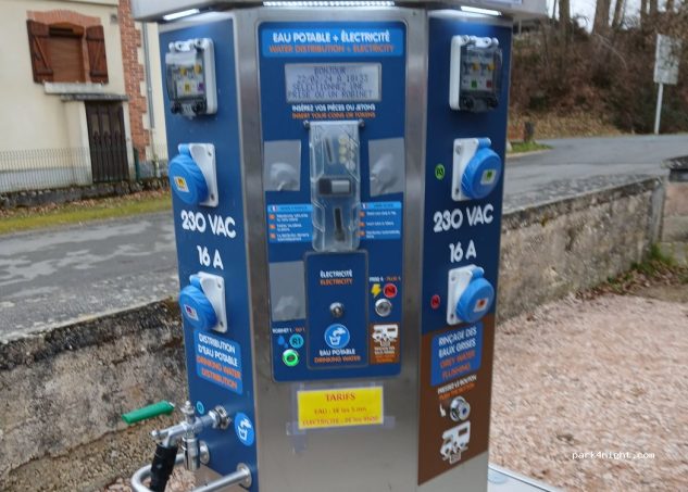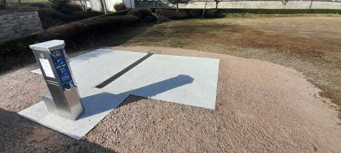 Cette installation réalisée sur un terrain semi herbeux, semi gravillonné, compte huit emplacements délimités par des traverses de chemin de fer enterrées. Pour les services, la commune a construit une vaste plateforme de vidange des eaux grises bordée d’une borne de très grande qualité fabriquée par l’entreprise auvergnate MIC Signaloc. Cette borne en inox fonctionne avec des pièces de deux euros ou des jetons à retirer chez les commerçants du coin.