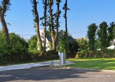 Les places de stationnement sont ainsi dessinées sur un parking qu'on partage avec seulement quelques voitures à la nuit tombée, non loin d'une école et à quelques minutes de marche d'un des plus beaux monuments de la commune : la chapelle Notre-Dame-du-Crann. Preuve tout de même que l'endroit a été pensé pour les utilisateurs de véhicules de loisirs, la présence d'une table de pique nique, agrémentée d'un toit. image
