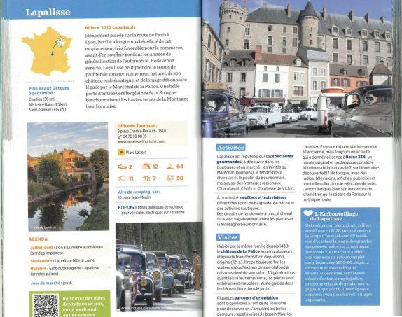 Mais ce qui est particulièrement plaisant pour les camping-caristes, c’est qu’à la fin de la description de chaque petite ville figure une fiche « technique » dans laquelle est indiquée le nombre d’emplacements dédiés à l’accueil des camping-cars. Et, autre bonne nouvelle, sur les 104 villes, extrêmement peu ne peuvent recevoir les camping-cars.