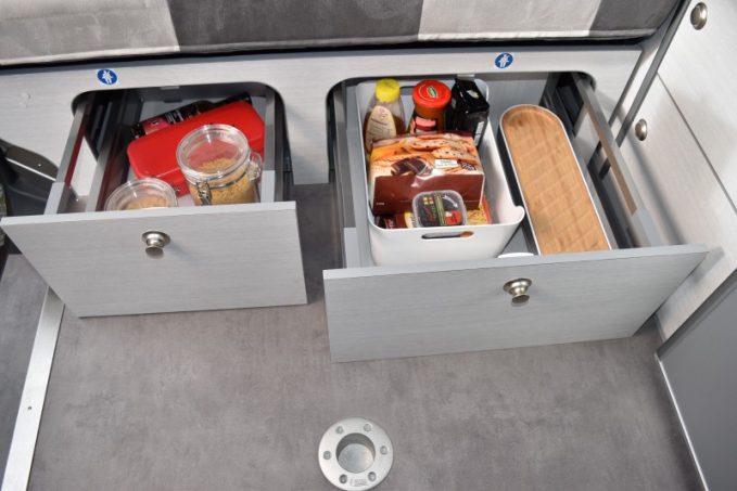 L’aménageur des Deux-Sèvres a soigné aussi le coin cuisine qui comprend un réchaud deux feux, un mini évier, divers rangements et un réfrigérateur à compression (65 litres). La contenance du réservoir (hors gel) d’eau propre n'affiche que 50 litres. L'alimentation en gaz est assurée par deux bonbonnes de 2,8 kg. En puisant dans liste du catalogue d'options, il reste possible de compléter le niveau d’équipements.