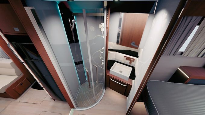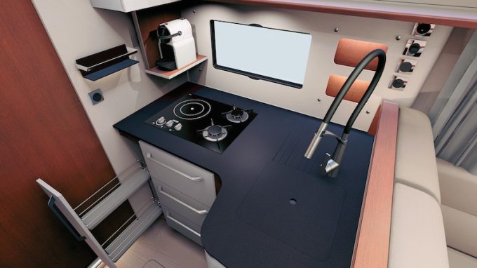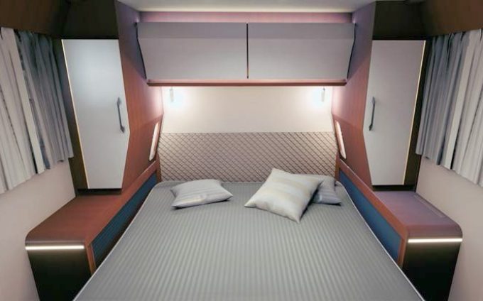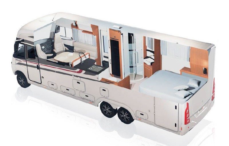 Les prochains modèles i1066 et i1090 reprendront l’ameublement raffiné de la Série Distinction déjà existante. Dignes héritiers des anciennes Série 10, avec leur longueur commune de 8,79 m, ces deux intégraux utiliseront un châssis AL-KO double essieu et seront motorisés par un 2,3 l de 148 ch. Ces véhicules reçoivent en série un double plancher rangement et une centrale de chauffage Alde. La cuisine, par rapport aux Distinction, devrait intégrer un réchaud à gaz et par induction, un emplacement pour une machine à café et un plan de travail au revêtement inédit. En matière d’agencement, le Rapido i1066 dispose de lits jumeaux en chambre arrière tandis que le i1090 (ci-dessous) bénéficie d’un lit central grande largeur (160 cm) à hauteur variable. Leur salon se montre classique avec une vaste banquette en L et un sofa latéral.