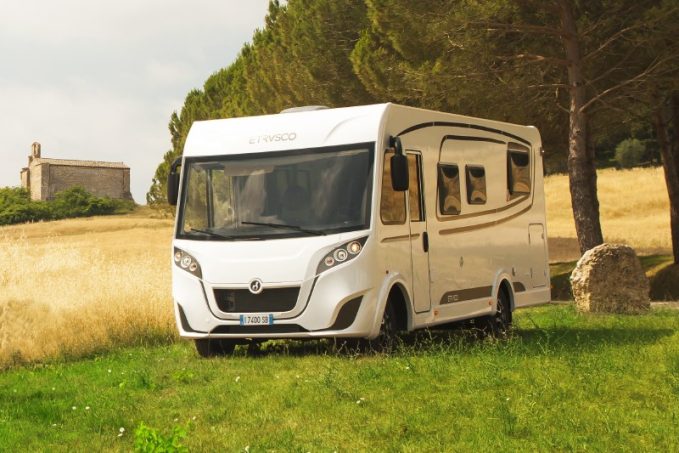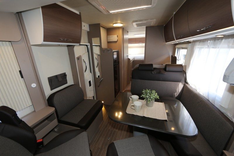 Comme pour les profilés de la collection 2018, les intégraux Etrusco bénéficient d'ambiances intérieures inédites (plus contemporaines) à base de coloris blanc et taupe, pour le mobilier, et de tissus clair (Piemonte) ou foncé (Andorra) pour la sellerie.