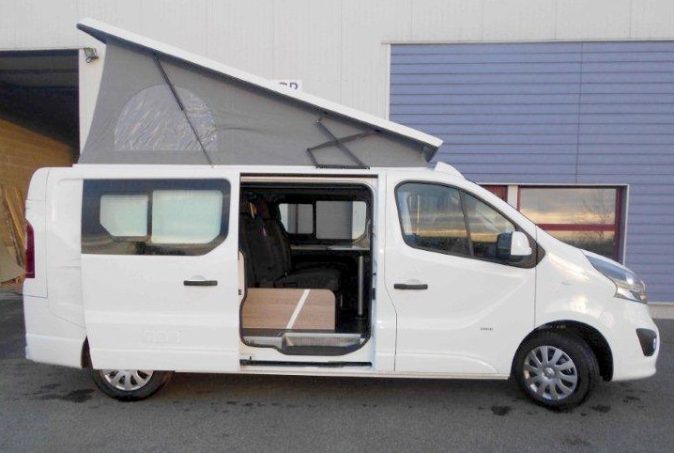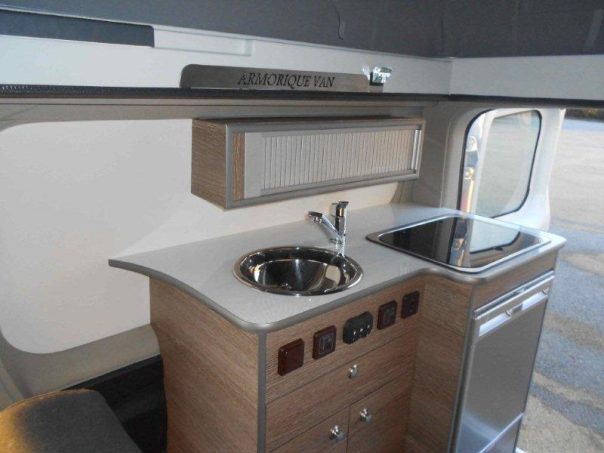 La nouvelle dénomination choisie par le carrossier breton, David Goberville, est surtout prétexte à dévoiler un nouveau modèle sur Opel Vivaro. Conçu pour quatre personnes, avec un salon central utilisant les sièges cabine retournés, ce fourgon Armorique Van se dote d'un toit relevable, par l'arrière, dissimulant un lit de pavillon pour les parents (200 x 140 cm). La banquette intérieure, transformable en couchage (189 x 112 cm), conviendra davantage aux enfants. L'utilisation d'une version à empattement long (L2H1) permet de disposer de plus d'espace et de rangements à bord. Le bloc cuisine comprend ainsi un réfrigérateur à compression de 65 l. Assez bien équipé d'origine (climatisation, régulateur de vitesse, radars e recul, volant cuir...), le véhicule embarque aussi un WC fixe et une douchette (pour une toilette extérieure).