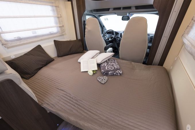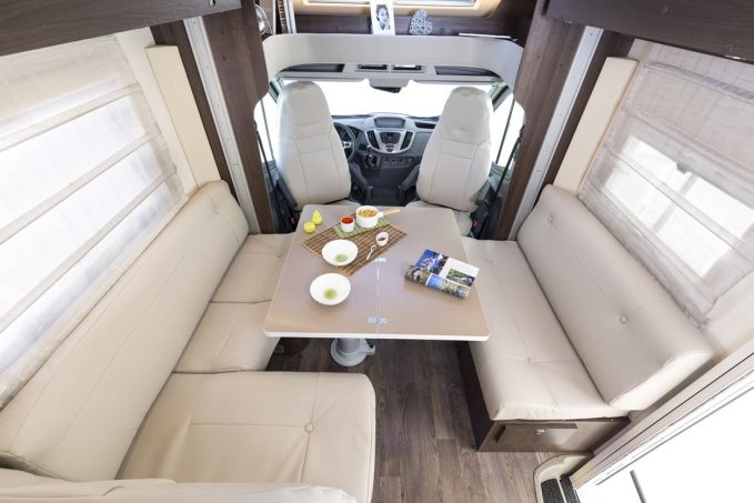 Ce Nacre reçoit également un grand salon et un bel équipement de série : caméra de recul couplée à un écran positionné sur le rétroviseur intérieur, stores de cabine Remis, panneau solaire, Pack confort, moustiquaire de porte...