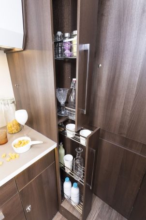 A contrario de ce dernier, ce nouveau camping-car vient combler un manque en matière de capacité de rangements beaucoup plus importante en partie arrière. Une soute vaste et haute peut recevoir plusieurs vélos ou un deux-roues motorisé. Un volume d’angle permet en plus de loger des objets longs, type skis ou cannes à pêche.