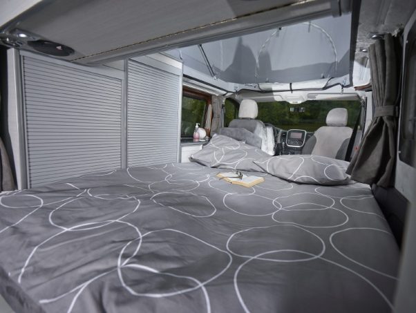 Sous le toit relevable, en pavillon, se cache un second grand lit (190 x 122 cm). Grâce au catalogue des options, vous pourrez ajouter un bac à douche central (690 €), un WC portable (110 €) ou encore un combiné chauffage/chauffe-eau à carburant (2 740 €).