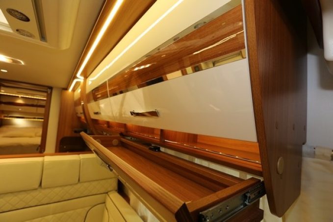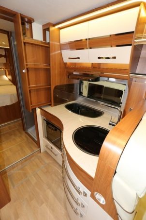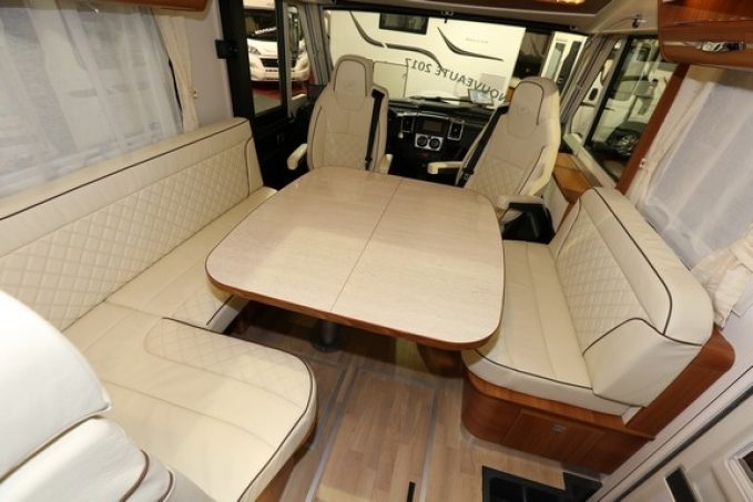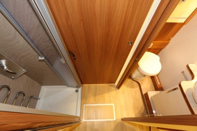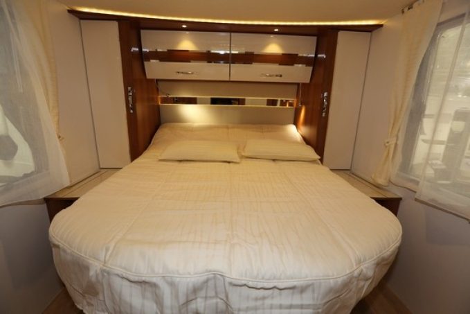 A l’intérieur pas de grandes surprises puisque ce camping-car opte pour un lit central agrémenté d’une douche indépendante du cabinet de toilette. Pour le confort, double plancher isolé et chauffage Alde de série, réfrigérateur de 190 l AES viennent enrichir la dotation standard importante. Sans oublier le réservoir d’eau propre porté à 300 l.