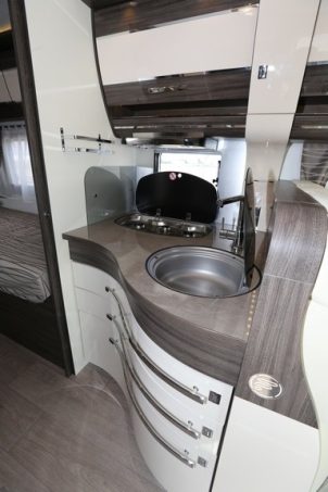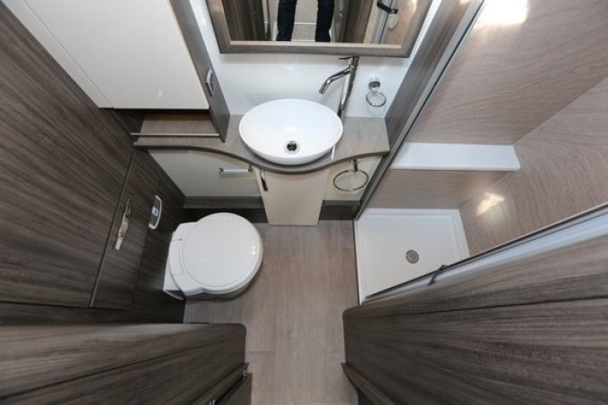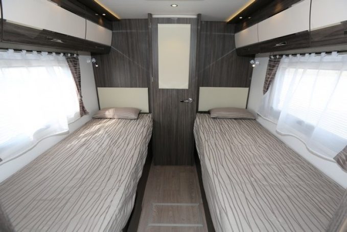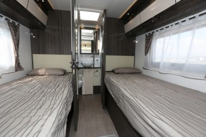 Greffé au châssis AL-KO double plancher, ce camping-car est donc un modèle inédit pour la marque et se démarque par une implantation ayant recours à des lits jumeaux. Des couchages indépendants certes mais agrémentés d’une salle d’eau transversale positionnée pour sa part contre le tableau arrière.