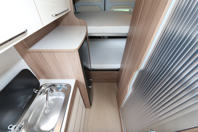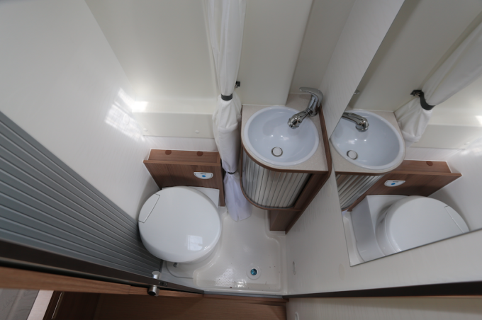 La vocation familiale du Fun D53 ne fait aucun doute quand on découvre sa chambre équipée de deux grands couchages superposés. Ils sont composés de 2x2 sommiers et matelas indépendants facilement amovibles pour offrir une modularité à la carte. Le lit inférieur (185 x 128 cm) se montre légèrement plus large, mais plus court, que le supérieur (187 x 126 cm). De quoi accueillir quatre ''rêveurs'' dans les meilleures conditions sans pour autant exploser son budget. Ce modèle, disponible uniquement en blanc, se montre assez discrêt et plutôt bien agencé bien qu'un peu léger en équipement.