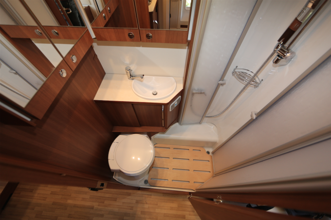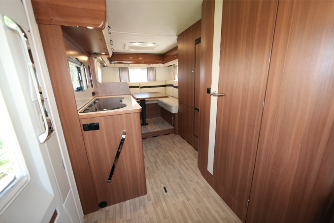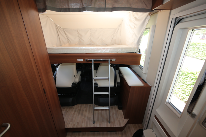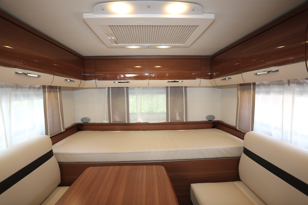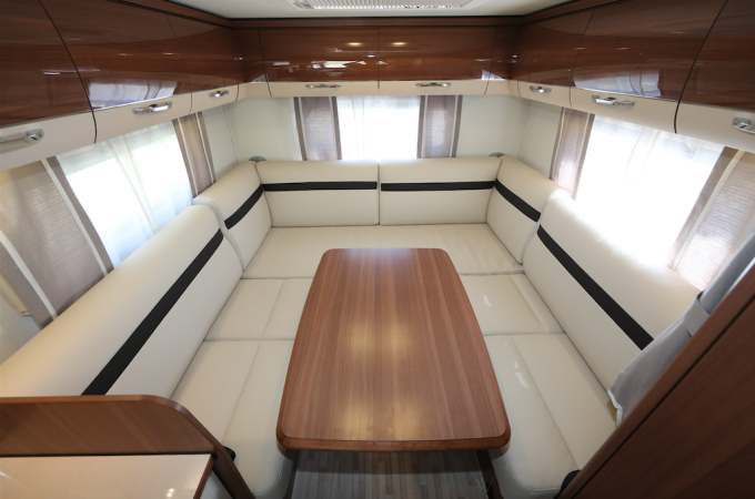 Permettant d’accueillir aisément six convives autour de sa table, le beau salon en U de l’Explorer I655G cache également une autre particularité : une banquette à hauteur variable à commande électrique. En position la plus élevée, cet aménagement permet d’accroître le volume de la soute, pour y glisser par exemple des vélos, mais aussi de disposer d’un lit supplémentaire confortable.