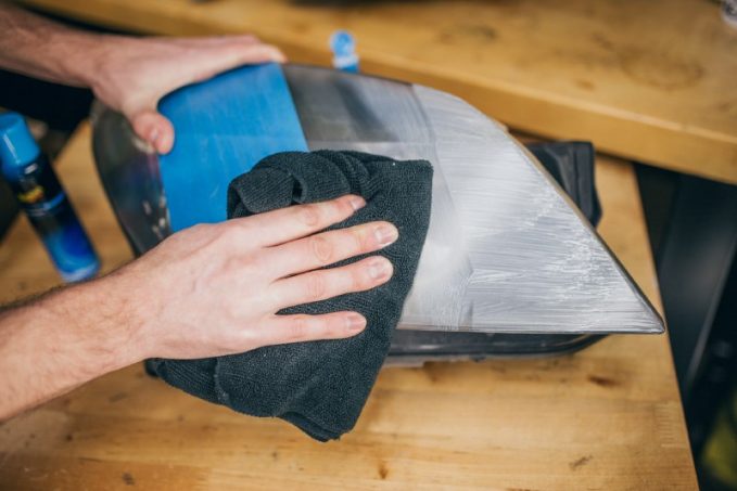 Nul besoin d'outils pour effectuer cette opération. L'ensemble comprend un disque abrasif et un polish spécial pour plastiques. Le ponçage de la surface s'effectue directement à la main. Il est suivi ensuite par l’application d'un spray de protection pour obtenir une clarté satisfaisante. Celui-ci empêche la ré-oxydation et le jaunissement durant au moins un an.