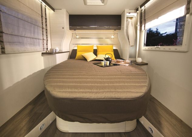 Pour passer d’un lit de 140 cm de large à 160 cm, il a néanmoins fallu trouver des solutions : les penderies encadrantes ont été réduites en pied. Chausson et Challenger par ailleurs, ont préservé la possibilité de lever ou descendre le lit à la demande, ceci afin d’augmenter le volume de la soute.