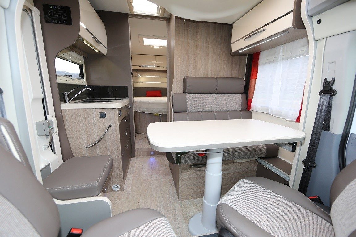 Celui-ci est un ultracompact de seulement 6,49 m, doté d’un vrai lit central. Intéressant, car le couchage est bien dimensionné (191 x 138 cm) alors que le modèle dispose par ailleurs d’un réfrigérateur étroit mais volumineux (141 litres) et d’un lit de pavillon électrique (une place).