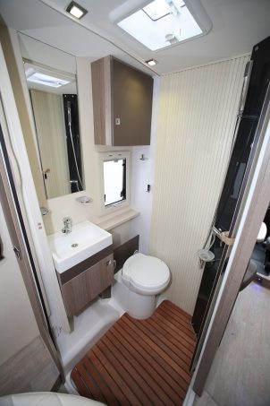 Comment présenter un lit central dans un profilé aussi court ? En ne proposant qu’une seule pièce toilette, où la modularité prime pour séparer la douche du coin lavabo, en réduisant le salon avec une cinquième place possible grâce à un strapontin près de l’entrée, en contenant également le volume du bloc cuisine.