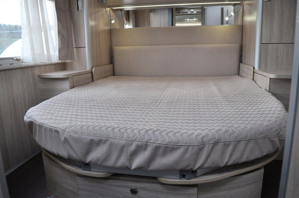 Il est pourvu d’un maxi salon capable de recevoir cinq à six convives (salon convertible en lit d’appoint). Sa cuisine en L comporte de vastes rangements ainsi qu’un réfrigérateur de 140 litres à sélection automatique d’énergie. Bien vu également, le lit central est à hauteur variable (sur 30 cm, avec moteur électrique) afin de moduler le cubage de la soute-garage.