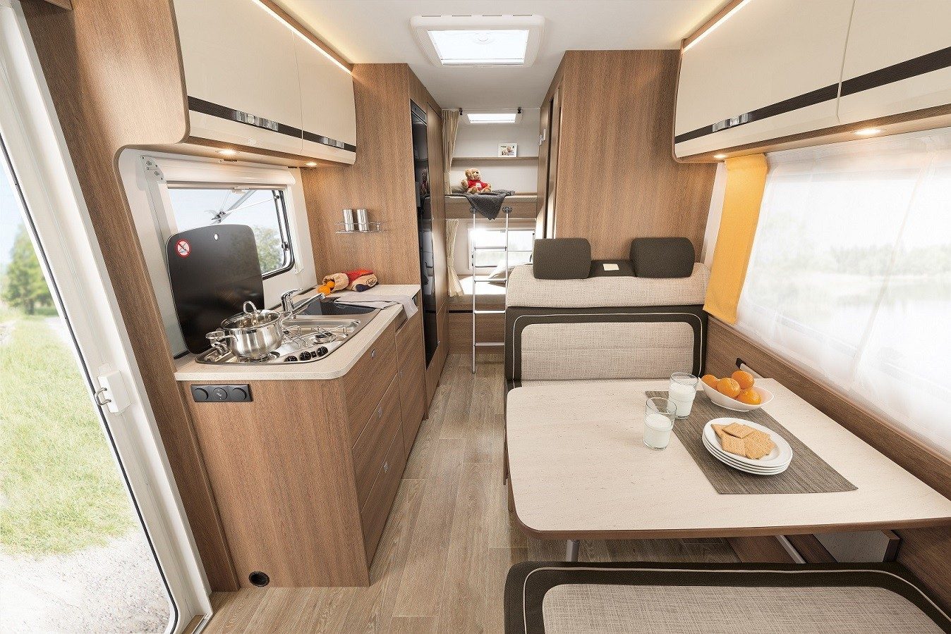 Qui dit capucine, dit bien sûr famille. Le salon se transforme donc en un lit double afin de compléter le couchage deux places de l’alcôve (commun aux deux versions) et les deux lits superposés du compact Trend A 5887 ou le lit double transversal arrière du plus spacieux Trend A 6977.