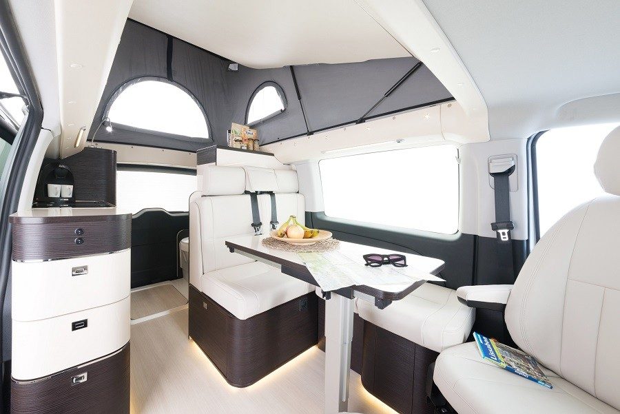 Comme ce dernier, le Kepler est sur VW T6, tandis que le Jules Verne lui préfère le Mercedes Vito. Taillés pour le voyage (moins de 2 m sur route), tous deux profitent du même plan –inédit- avec toit relevable toilé et d’une véritable autonomie d’usage.