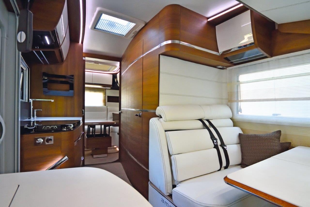 A ces proportions généreuses, l’America ajoute un double plancher avec chauffage central Alde à canalisations rigides. Tout cela n’empêche pourtant pas le luxueux italien de revendiquer un ptac de 3500 kg, faisant confiance au porteur Fiat Ducato (en 130 ch de série) pour mener l’ensemble. Chaque Arca America reçoit un numéro : 1 pour le salon en U arrière, 2 pour le lit central et 3 pour les lits jumeaux. De l’extérieur à l’intérieur, le design de classe internationale est omniprésent. La carrosserie Alufiber se marie avec une façade avant monobloc plus une paroi arrière et des jupes en polyester.