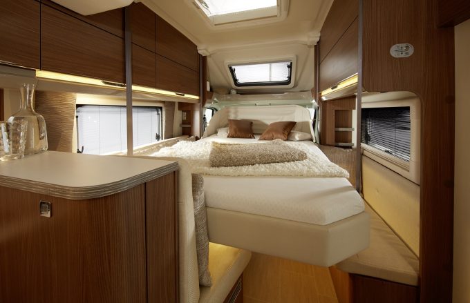 Ce choix se remarque déjà de l’extérieur, avec une forme de casquette inédite, inclinée sur les côtés. A bord, surtout, ce fameux lit longitudinal, est parfaitement intégré contre le plafond. Le couchage double (200 x 137 cm) descend et remonte électriquement, entre des placards de pavillon qui restent fixes et volumineux. En place, il est accessible sans échelle puisqu’il se positionne au niveau des banquettes du salon, à seulement 75 cm du sol.