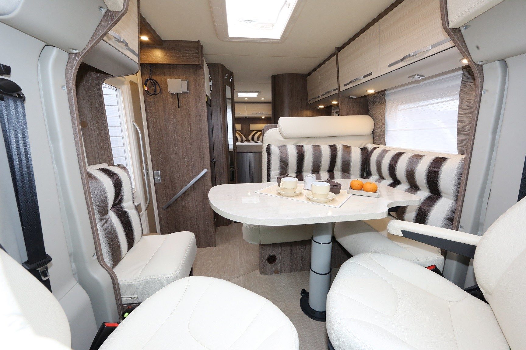 Son maxi salon, joliment mis en valeur par des housses en très beau simili cuir couleur crème, se montre confortable. La grande table centrale coulisse dans tous les sens. Les rangements sont multiples, les placards de pavillon étant notamment pourvus d’étagères réglables en hauteur.