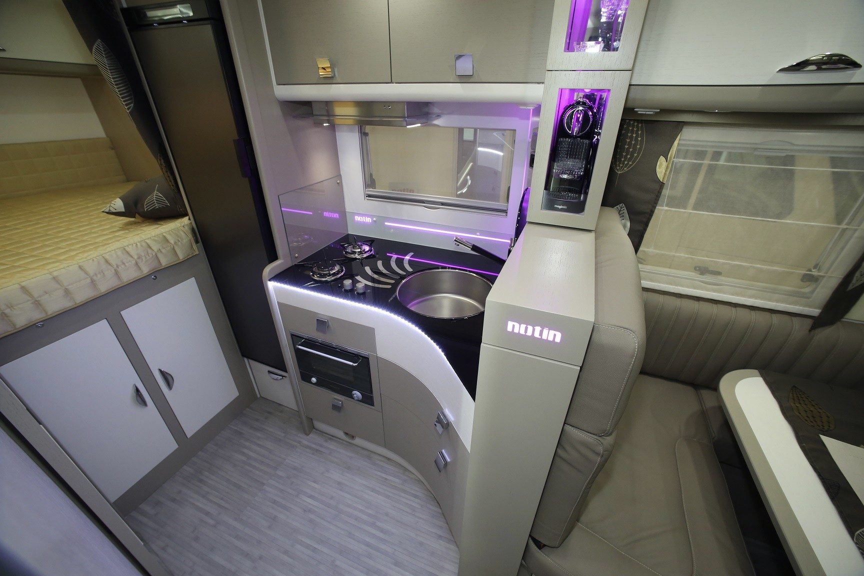 Ce nouveau Notin se démarque avant tout par sa petite taille (6,50 m seulement). L'implantation transversale de son lit double favorise la présence d’une belle soute. Bien vu, deux grandes penderies ont été aménagées sous le lit et un tiroir sert de marchepied pour accéder plus facilement au couchage. Notez aussi la présence d'un réfrigérateur étroit de 140 litres, d'une porte d'accès à la salle d'eau coulissante ou encore d'un couchage de pavillon électrique à largeur variable (90 à 130 cm).
