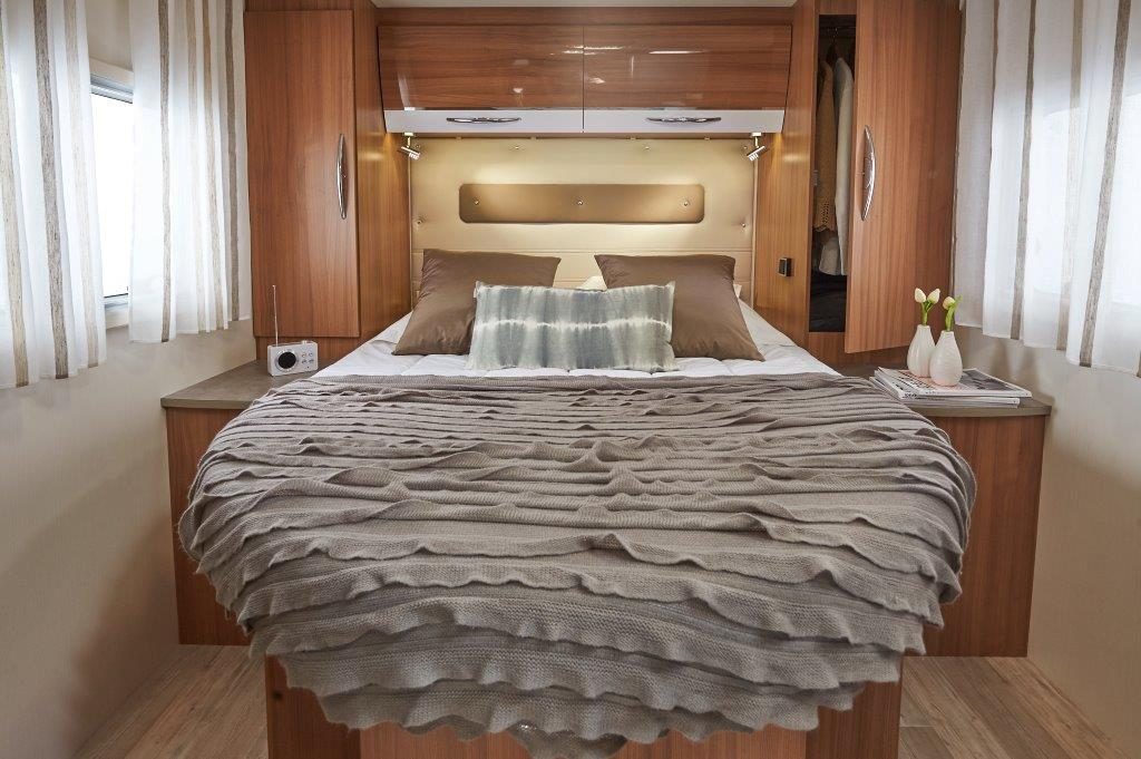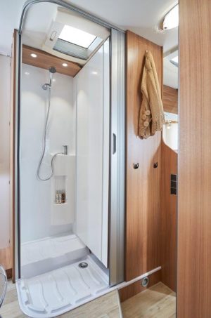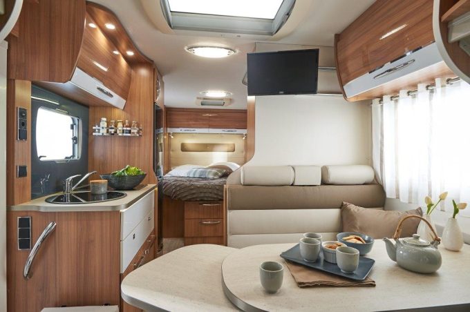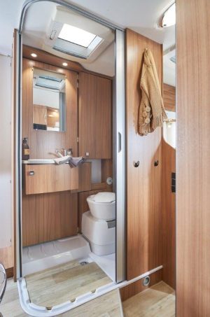 D’ordinaire, portant, il est déjà difficile de concevoir une cellule de ce longueur, pleine de tous ses éléments : salon, cuisine, salle d’eau, penderie, soute ou garage et chambre classique. C’est bien là tout l’intérêt du P 650 C. Faisons le compte des concessions faites à ce couchage princier. Elles sont finalement assez minces : 4 places carte grise et 3 à 4 couchages, une salle d’eau modulable sans douche indépendante et une 5e place repas un poil sommaire, par strapontin escamotable.