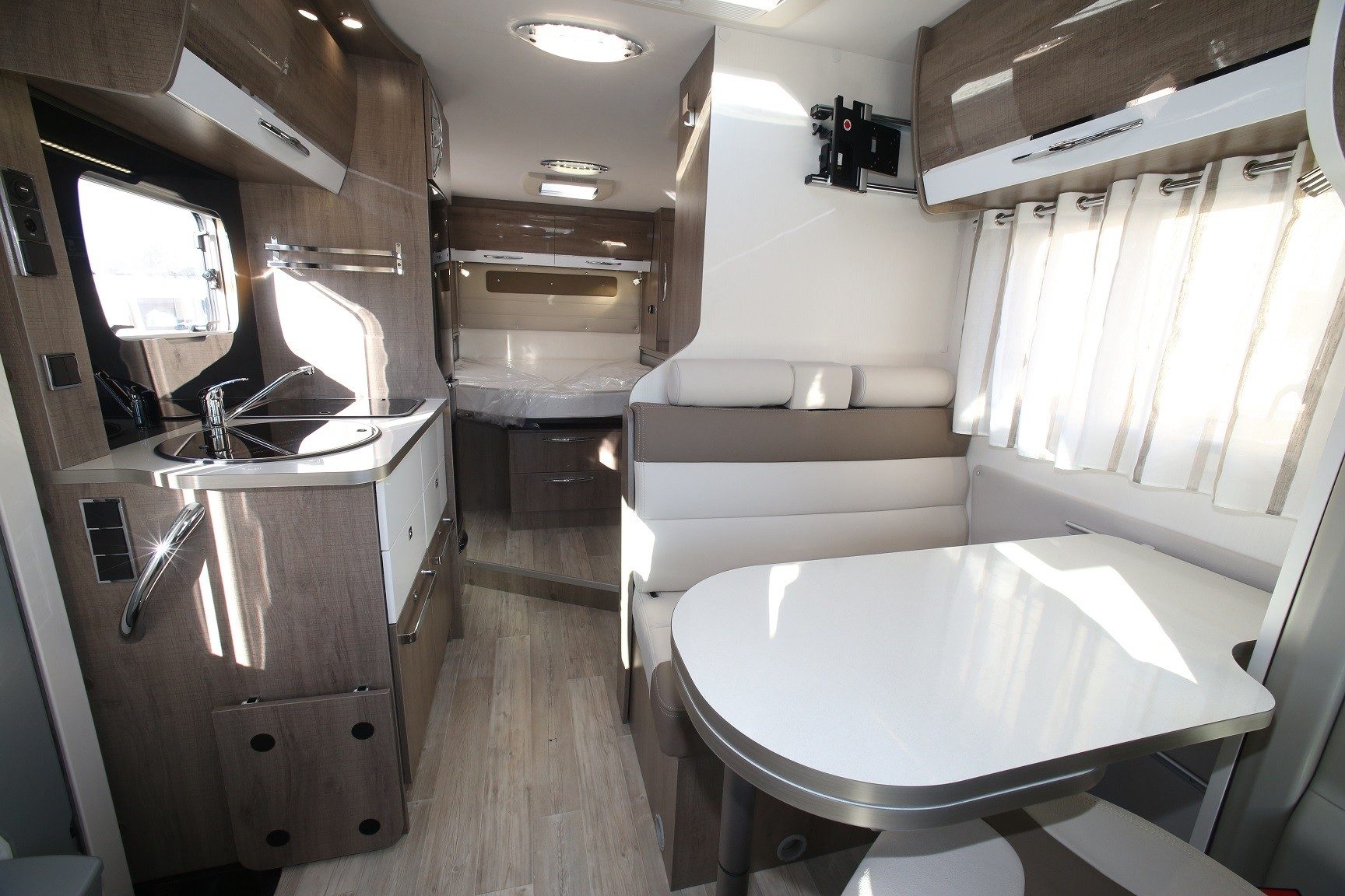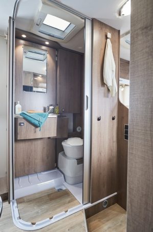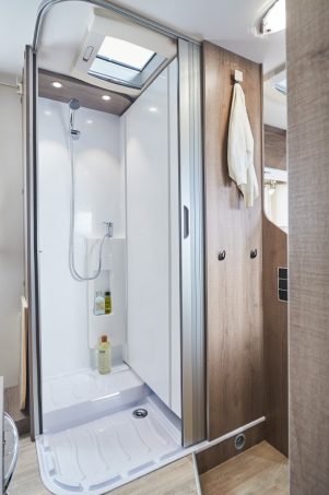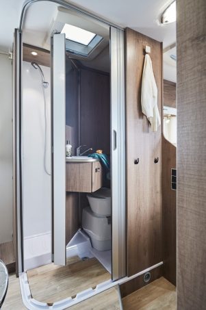 Le lit, vraiment central, du tout nouveau T 650 C Style dispose de double voies d’accès équilibrées, d’une tête de lit soignée, d’une double penderie, et d’une rangée de placards de pavillon et lingères au pied. Le salon, lui, se définit comme une simple demi-dînette. Son plateau de table est accompagné d’une rallonge. Parmi les astuces, citons la présence d’un strapontin, contre le meuble de cuisine, pour former une 5e place repas. La salle d’eau surprend encore plus, jouant la carte de la modularité optimale pour libérer un bel espace douche grâce à une paroi pivotante.