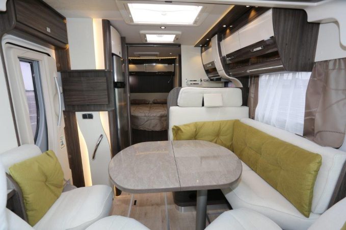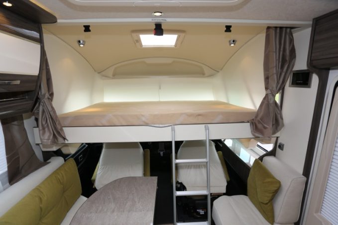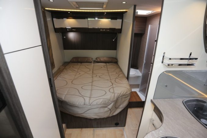 Bien plus compact que ses pairs, il se contente d’une longueur de 6,59 m pour loger un plan à lit central (décalé vers la gauche) et un maxi salon. Espace douche et WC sont néanmoins regroupés en une seule et même pièce. En fait, il reprend l’agencement du profilé Mayflower 65 LMX mais y ajoute un lit de pavillon en bonus.