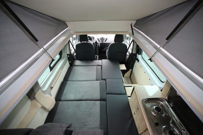 Pour coucher quatre personnes : le toit relevable comprend un lit de pavillon et la banquette face à la route est convertible en lit double.