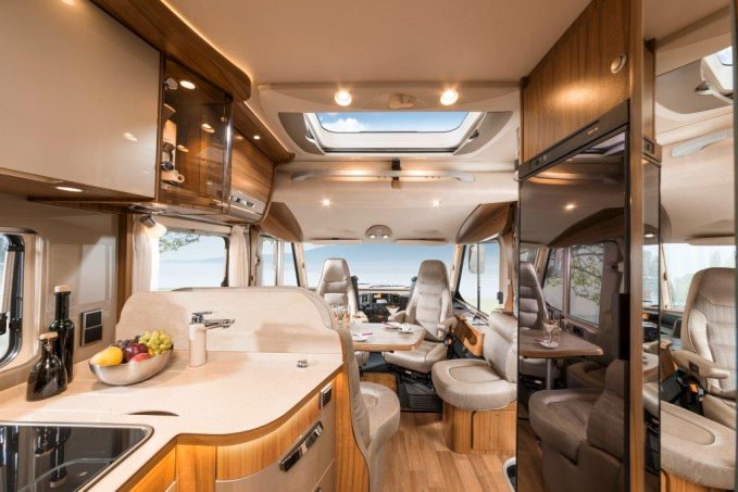 Il s’agit là d’un Classe B 598 bridé sur châssis Fiat Ducato. Notez ici ses trois principaux atouts : seulement 6,99 m de long, un vrai lit central de 190 x 140 cm, et une finition inédite particulièrement séduisante.