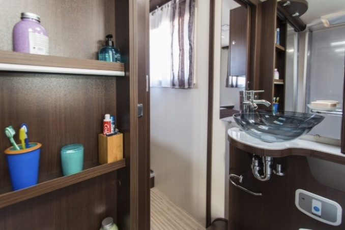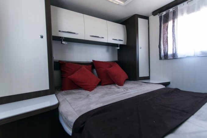 Le constructeur ibère exploite, comme ses concurrents, la salle d’eau de milieu mais sans positionner le lavabo au centre. L’espace de circulation est libéré de tout obstacle. Le Mileo 294 offre ainsi trois véritables espaces à vivre avec une chambre à lit central, un cabinet de toilette délimité par des cloisons coulissantes et une salle à manger/cuisine, dans laquelle prend place le nouveau réfrigérateur étroit Thetford. Ce profilé, homologué cinq places (carte grise, jour et nuit) reçoit un équipement digne de ce nom (climatisation cabine, régulateur de vitesse, deux airbags, autoradio CD avec commandes au volant, caméra de recul). Son bouclier avant, peint, intègre des projecteurs antibrouillard mais également des feux de jour à leds.