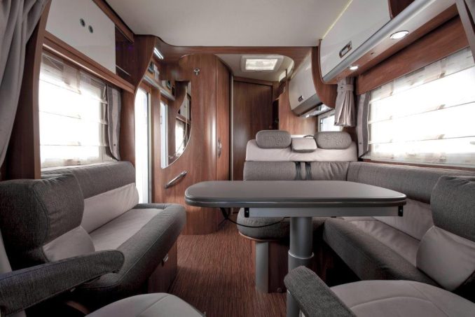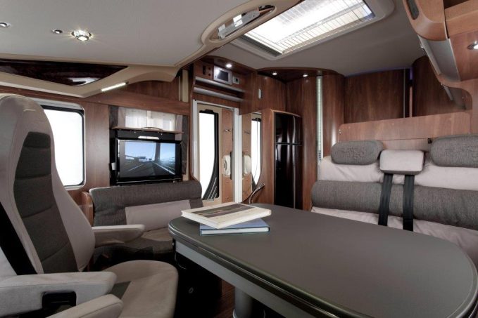A l'intérieur, l'ambiance est plutôt “premium”, avec une séduisante décoration Rovere Trentino (blanc nacré habillant les portes de placards et tiroirs). Le miroir éclairé, à l'entrée de la porte de cellule, ainsi que les poignées chrome satiné, apportent une touche haut de gamme. De nouveaux tissus biton, en microfibre, recouvrent coussins et sièges cabine. Les appuie-tête et tapis d'entrée sont aussi parés de discrets logos “50 ans”.
