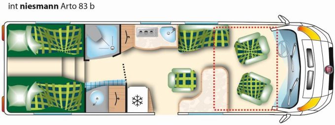 L’Arto 83 B se contente, lui, de “seulement” 8,25 m. Sa chambre est composée de lits jumeaux, transformables en couchage XXL. Le salon est organisé à la façon "bar", comme vous pouvez le découvrir sur ce plan.