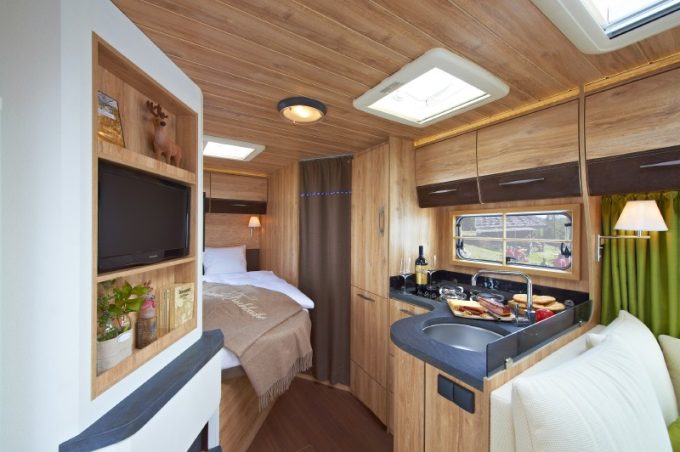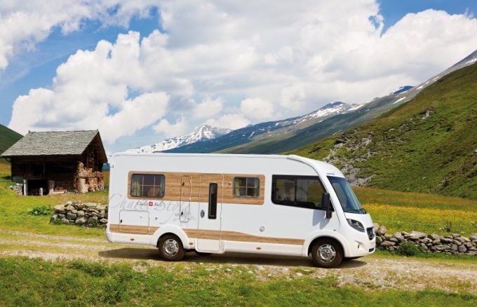 Pour preuve, ce surprenant Integra Line 670 SB joliment décoré à la façon d'un chalet suisse. Le placage bois extérieur est reproduit à l'aide d'un film adhésif. La cellule reçoit, elle, une décoration spécifique. Du sol au plafond, tout est recouvert de bois ou de cuir. Le mobilier ainsi que le tissu des assises et des rideaux fleurent bon les vacances de Noël. Une fausse cheminée trône même à gauche de l'entrée. Des panneaux en véritable ardoise décorent la salle d'eau. L'éclairage est assuré par des lampes avec abats jour. Cette ambiance ''Chalet Style'' sera proposée par Eura Mobil, sur le marché allemand, moyennant une option globale facturée 9 990 €.