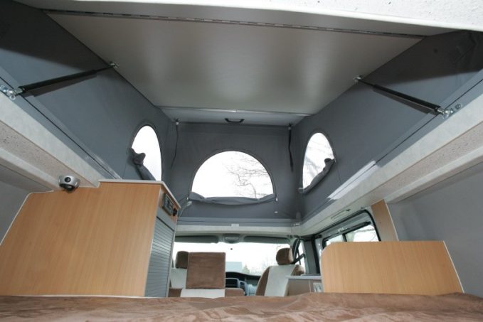 En plus du lit arrière transversal (190 x 120 cm), un second lit (220 x 135 cm) prend place sous le pavillon. La banquette RIB se transforme au besoin en cinquième couchage pour un enfant. Ce fourgon dispose à la fois d'une belle soute et d'une bonne charge utile (550 kg). Parmi ses équipements de base, notez la présence d'un réfrigérateur de 65 l, d'un chauffage Webasto à carburant, de WC Porta-Potti Thetford, ou encore d'une réserve d'eau propre de 80 l (eaux usées 50 l).