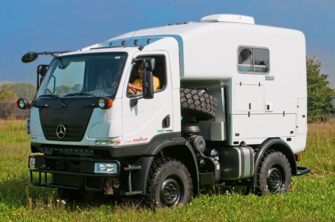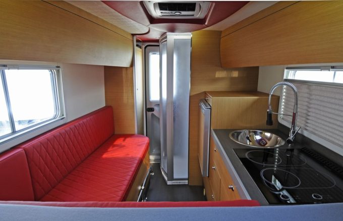 Le Modul Truck se présente comme une cellule fixe monocoque, bridée sur le dernier Mercedes Unimog U20. Malgré sa compacité, et un accès plutôt haut perché, celle-ci propose un confortable salon quatre places. Toutefois, seule deux personnes peuvent dormir à bord. Le coin cuisine comprend un évier, une plaque chauffante vitro céramique et un petit frigo. A l'arrière, après transformation, on dispose d'un cabinet de toilette avec WC et douche. Pour voyager en pays chauds, la climatisation n'a pas été oubliée.